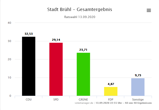 Unser Bürgermeisterkandidat Dr. Matthias Welpmann konnte 17,47 % aller Stimmen auf sich vereinen. Damit reichte es zwar nicht für die Teilnahme an einer Stichwahl, dennoch verdient das Ergebnis Beachtung: Noch nie hat in Brühl ein GRÜNER Bürgermeisterkandidat über 10 % der Stimmen auf sich vereinen können. „Insofern ist das Ergebnis bemerkenswert“, so Matthias Welpmann in einer Stellungnahme. Trotz erschwerter Wahlkampfbedingungen im Zeichen der vorherrschenden Pandemie nutzte Matthias Welpmann jede Gelegenheit, mit Brühler Bürger*innen ins Gespräch zu kommen und in Podiumsdiskussionen GRÜNE Ideen für Brühl vorzustellen. Wir danken ihm von ganzem Herzen für sein wertvolles Engagement.