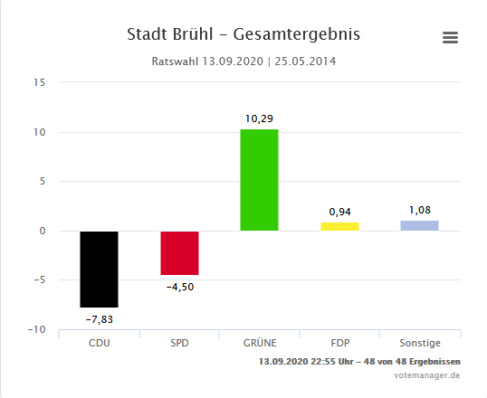 Die Kommunalwahl 2020 in NRW ist Geschichte – Zeit, einen Blick auf die Brühler Ergebnisse zu werfen. Um es kurz zu machen: <link aktuelles aktuelles-detail article gruene_erfolge_der_letzten_jahre>Unsere Erfolge und Initiativen aus der vergangenen Ratsperiode wurden von den Brühler*innen gesehen und honoriert: Mit 23,71 % der Stimmen konnten wir bei der Stadtratswahl einen klaren Zugewinn von 10,29 % im Vergleich zur letzten Wahl verzeichnen; ein Trend, den so nur die GRÜNEN in Brühl vorweisen können. Mit Robert Saß (Wahlbezirk 12) und Belá Kassan (Wahlbezirk 19) konnten zwei Kandidaten ein Direktmandat erringen. Statt bisher sechs, werden im neuen Stadtrat elf Fraktionsmitglieder vertreten sein. Insgesamt also ein Ergebnis, das Vorstandssprecher Robert Saß zurecht als „historisch“ bezeichnet. Vor allem aber auch ein Ergebnis mit einer Botschaft: Brühler Bürger*innen wünschen sich eine zukunftsorientierte, klimafreundliche Politik, die die kommenden Generationen im Blick hat. Den Folgen des Klimawandels muss durch ausgewogenes Flächennutzungsmanagement begegnet werden, die Stadt muss für Bürger*innen ein attraktiver Ort zum Leben sein, Schulen müssen optimal ausgestattet und Familien entlastet werden. Daran möchten wir in der kommenden Ratsperiode <link kommunalwahl-2020 wahlprogramm>entscheidend mitgestalten, denn dies sehen wir als Auftrag der Wähler*innen an uns. Mit welchem Partner, ist indes noch offen und Gegenstand weiterer Gespräche in den nächsten Tagen. Nicht verhandelbar wird dabei das Nein zum Heider‑Bergsee-Campus an dieser Stelle sein.