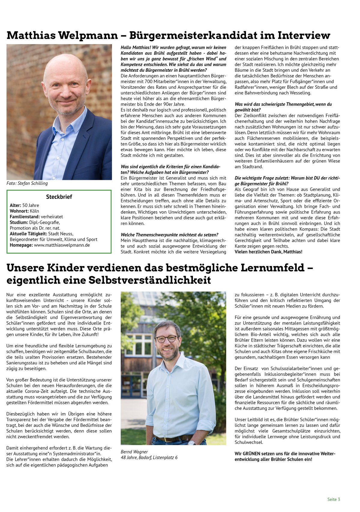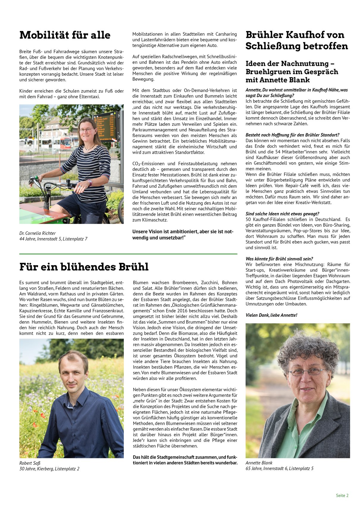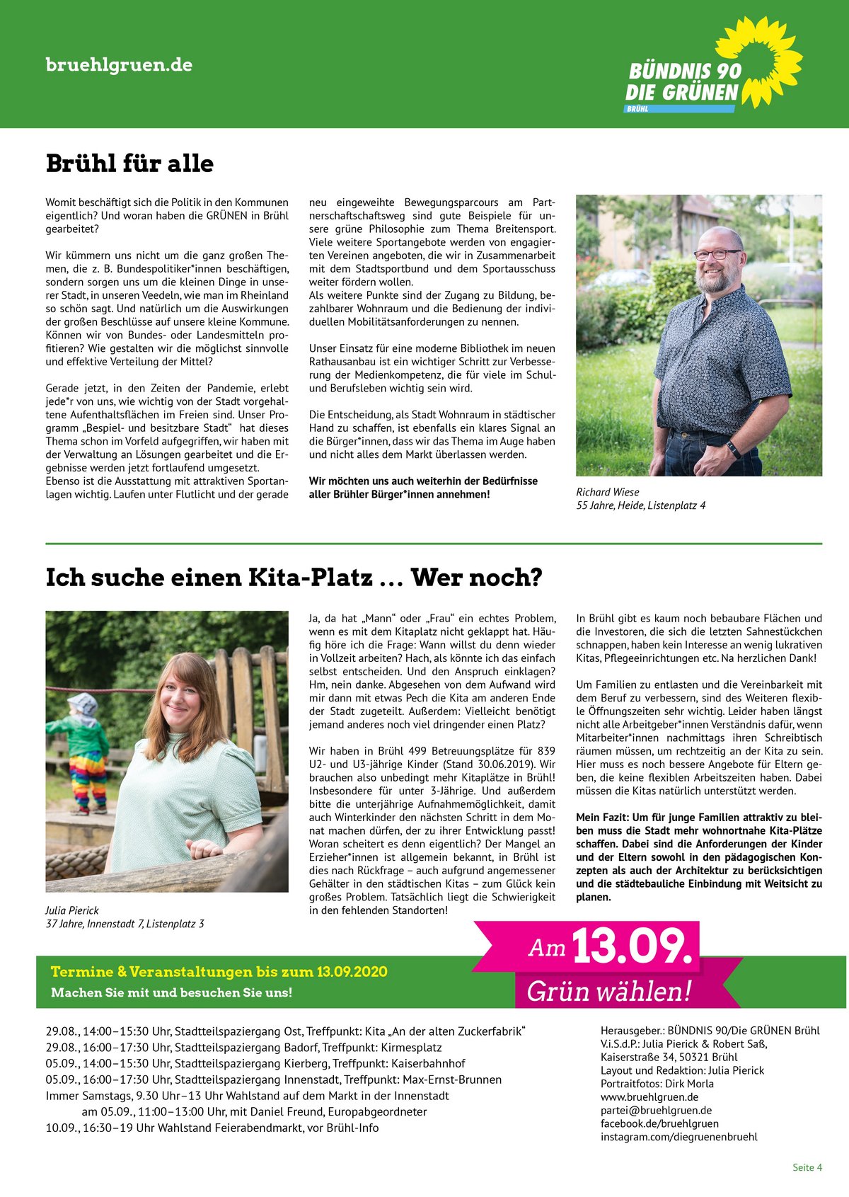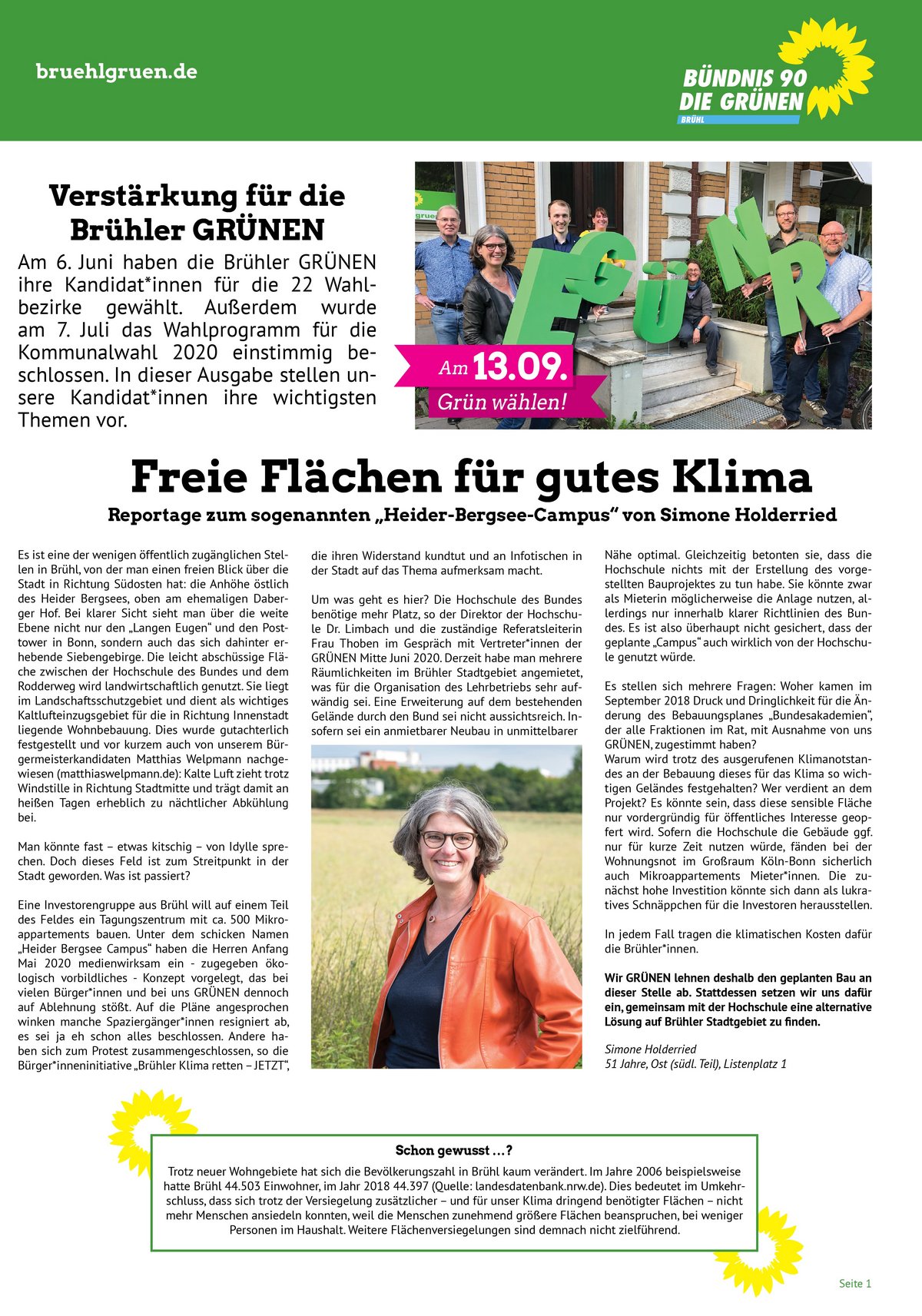 In der Kommunalwahlausgabe unserer Zeitung "Brühlgrün" stellen unsere Kandidierenden ihre wichtigsten Themen vor, vom Heider-Bergsee-Campus, über das ökologische Grünflächenmanagement, moderne Schulen, flexible Kitas bis hin zur Verkehrswende.